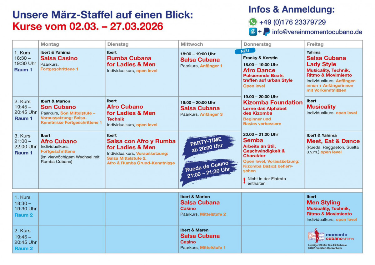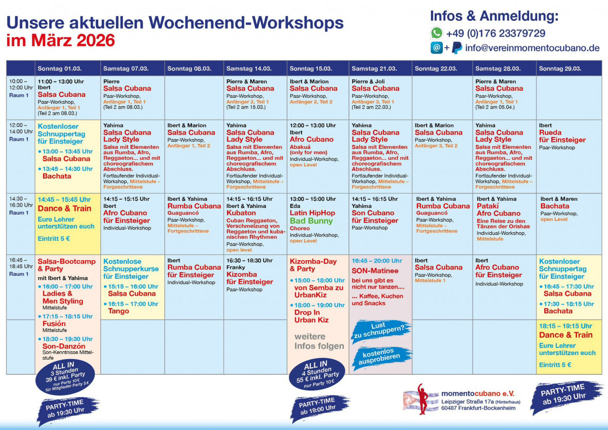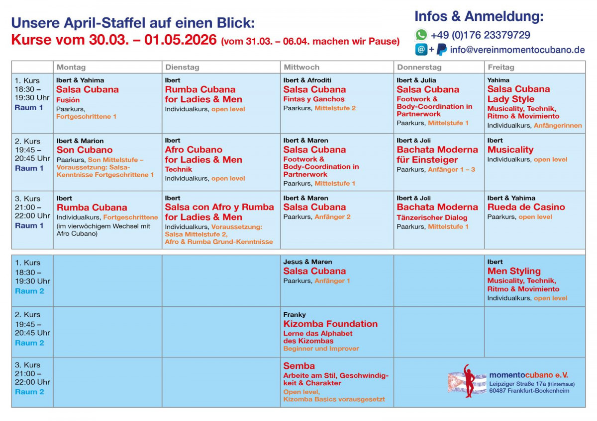 Achtung: Derzeit laufen alle Anmeldungen zu Kursen & Workshops und Anfragen über Whatsapp/SMS: +49 176 2337 9729 oder Email: Info@vereinmomentocubano.de. Bitte kontaktiere und auf diesem Weg. Danke für dein Verständnis!